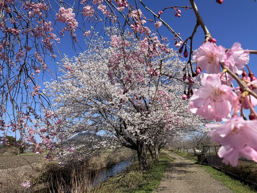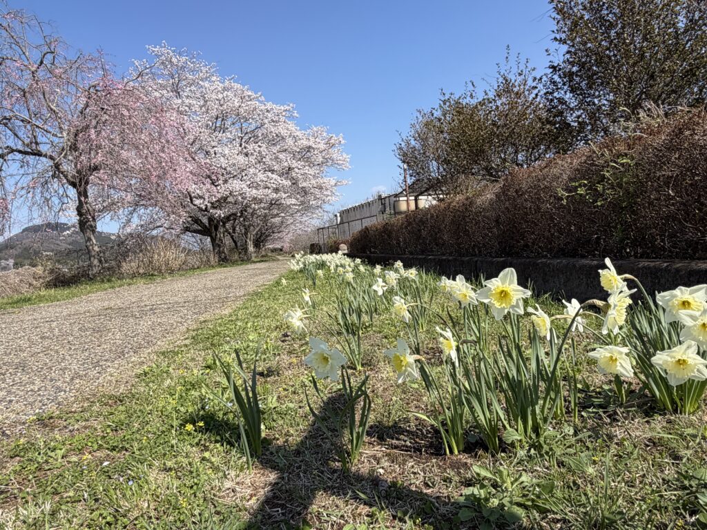 梵天の湯の周辺も桜が咲きました 2026年4月3日 梵天の湯ブログ 梵天の湯の前には、川と遊歩道があり、ソメイヨシノなどの桜が並んでいます。 水仙も咲き、のどかな春の小径となっています。 (2026年4月3日現在の風景) ぜひ温泉とともに、満開の桜をたのしみにいらしてください。
